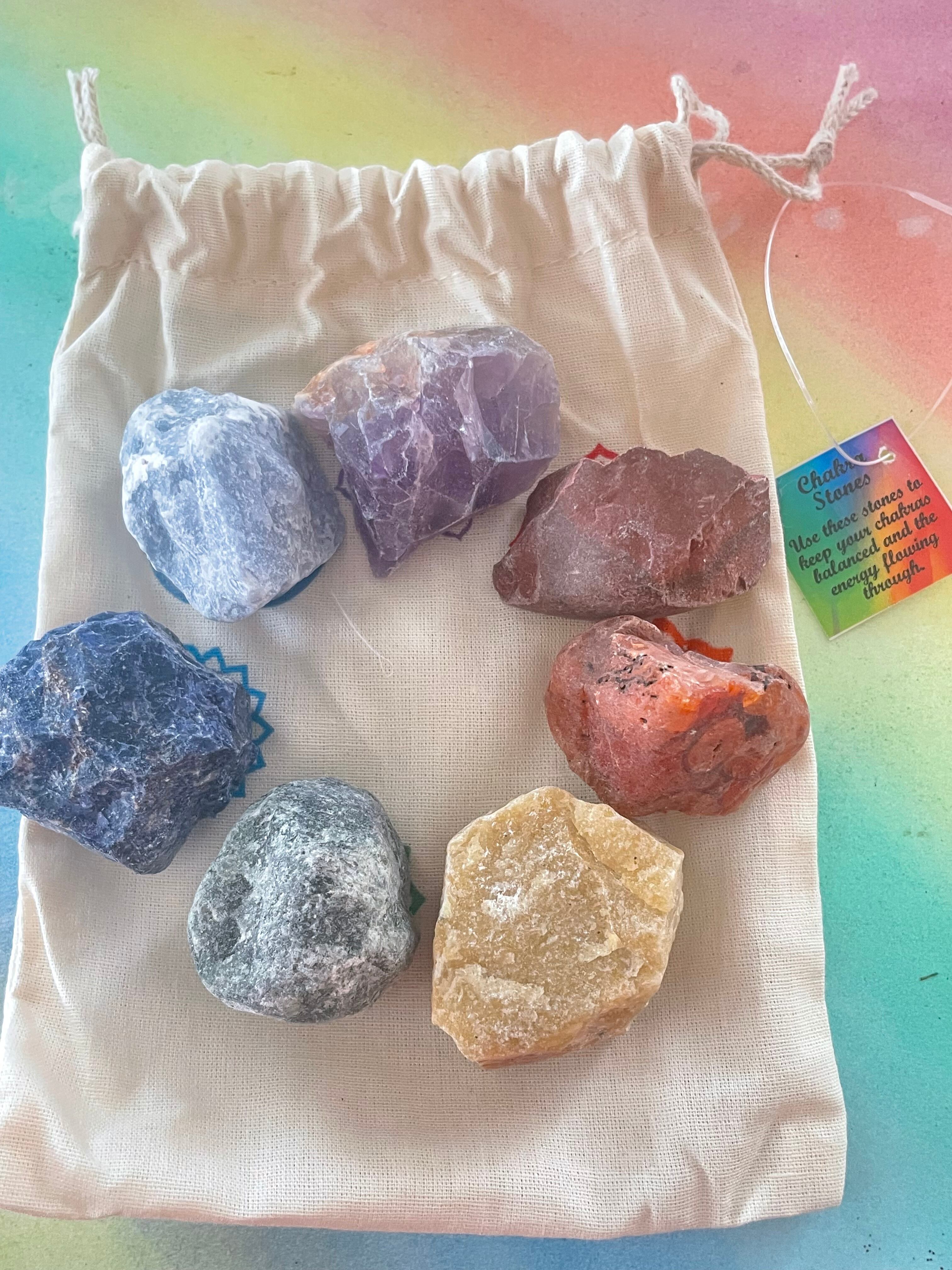 こちらは7色のチャクラ対応の天然石原石に、さらにヤントラ(シンボルマーク)がプリントされたポーチとのセットです。持ち歩きにも便利な小ぶりなサイズ感。(袋サイズは14cm×11cm)